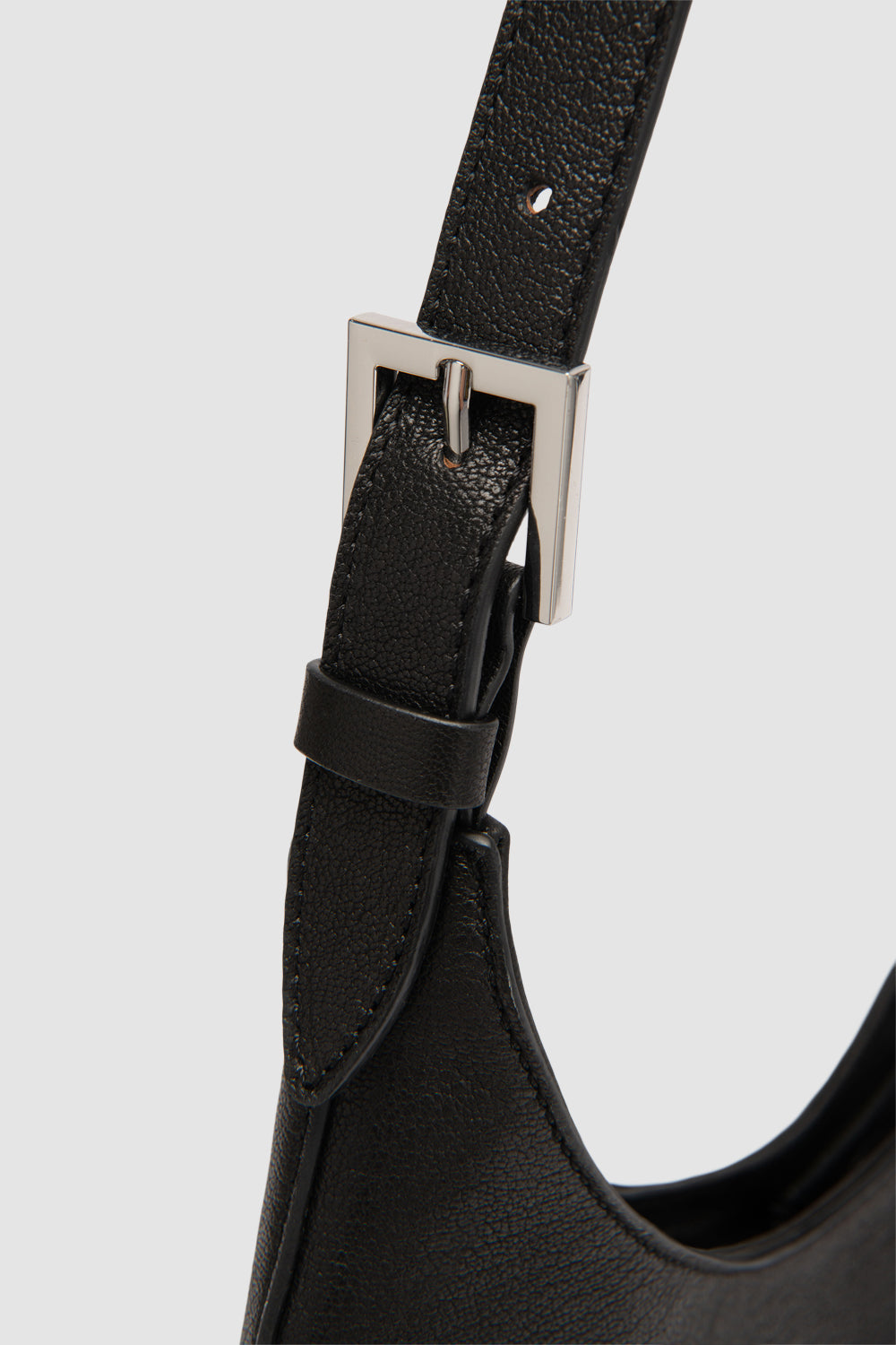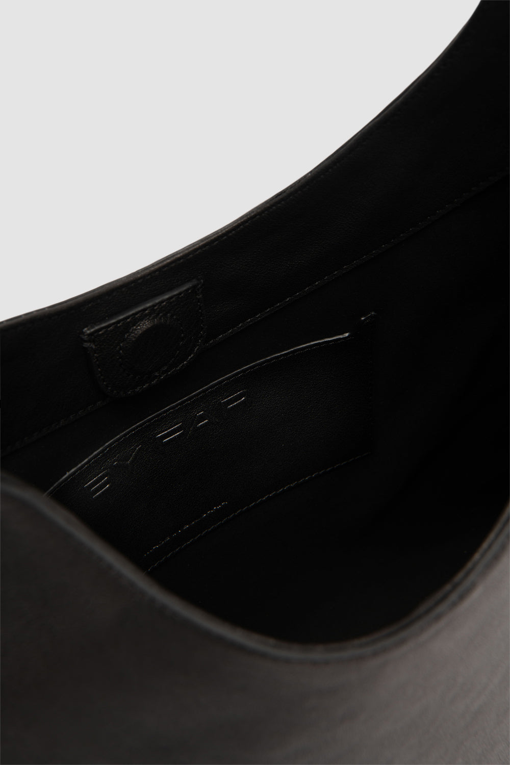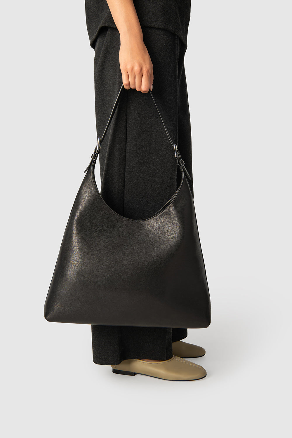 Large structured leather shoulder bag with adjustable shoulder strap and magnetic closure. Features one large compartment with micro suede lining and interior branded leather patch pocket. Fits a 13-inch laptop.